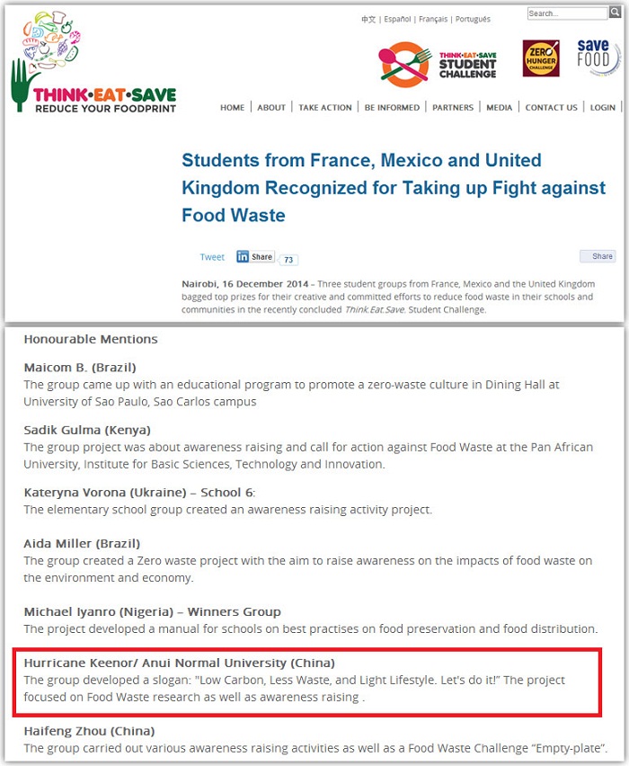联合国环境规划署“思前·食后·厉行节约”学生挑战活动获奖名录