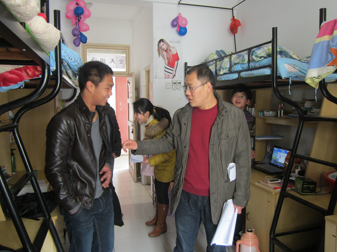 随后,学院学工组在党委副书记罗振的带领下深入学生宿舍,认真查看了同学们的起居用具,宿舍卫生状况,并关心同学们寒假过得怎么样,学期初是否制定了学习计划,生活上有没有困难,叮嘱大家将自己的精力迅速投入到学习生活中来;罗书记还表示,全体学工队伍务必高度重视学生的安全稳定工作,勤下基层,多进宿舍,听真话、办实事、转作风、求实效。