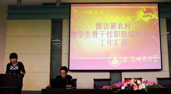 张鑫首先对学院2011年暑期社会实践活动的开展情况做了简要概括,并介绍了奖项设置和具体评分细则。随后,来自学院2009、2010级各专业的14支重点实践团队紧紧围绕“永远跟党走,青春献祖国”的主题,依次汇报了实践开展情况,汇报现场新颖不断,惊喜频频,他们创意精美的PPT展示、激情生动的现场演说、独具匠心的汇报方式赢得在场同学的阵阵欢呼及评委老师的高度肯定。