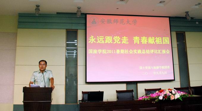 9月9日晚,国旅学院在院实验楼101教室隆重举行2011年暑期社会实践总结评比汇报会。学院党委副书记罗振和全体辅导员出席汇报会并担任评委,会议由辅导员张鑫老师主持。