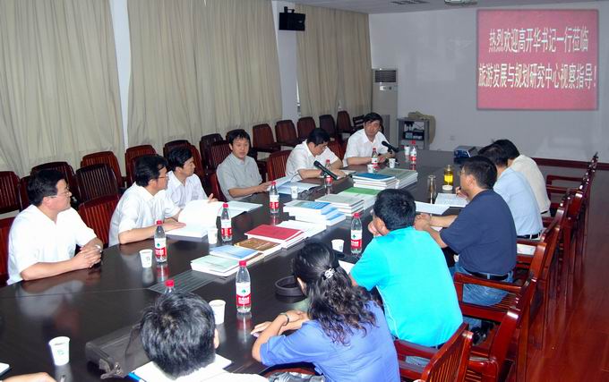 高开华在听取汇报后,充分肯定了旅游发展与规划研究中心近年来所取得的成绩。他指出,该中心经过多年建设,已经具备了较好的发展土壤;培养了结构合理的学术梯队,形成了较好的科研团队;通过长期努力和积淀,凝练出了较好的研究方向;科学研究和社会服务,取得了较好的成果;面向地方经济社会的发展需要,展现出了较好的发展势头。他结合中心“十二五”规划的编制,要求旅游发展与规划中心要突出应用研究,进一步提高社会服务水平;要突出成果转化,进一步加强研究成果向教学和地方决策的转化;要突出成果展示,进一步做好建设成效和研究成果的宣传和推介工作。