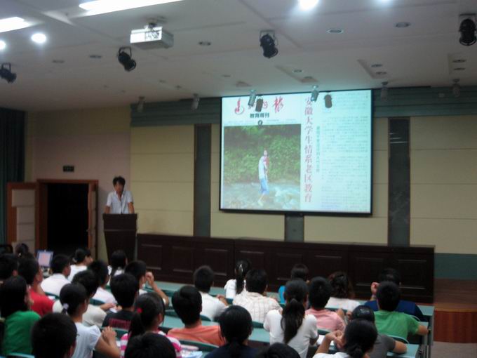 紧接着,优秀事迹宣讲团的十位学生代表以PPT的形式依次汇报了各自的暑期实践经历。在汇告中,汪继斌同学在四川灾区无偿奉献的支教生活让在坐的各位新生热泪盈眶;“和谐之旅”校级重点小分队的警民共建和谐社会的活动让同学们听得津津有味;学生代表暑期打工“咸水鸭”经历令在场同学捧腹大笑……现场不时传出阵阵掌声。
