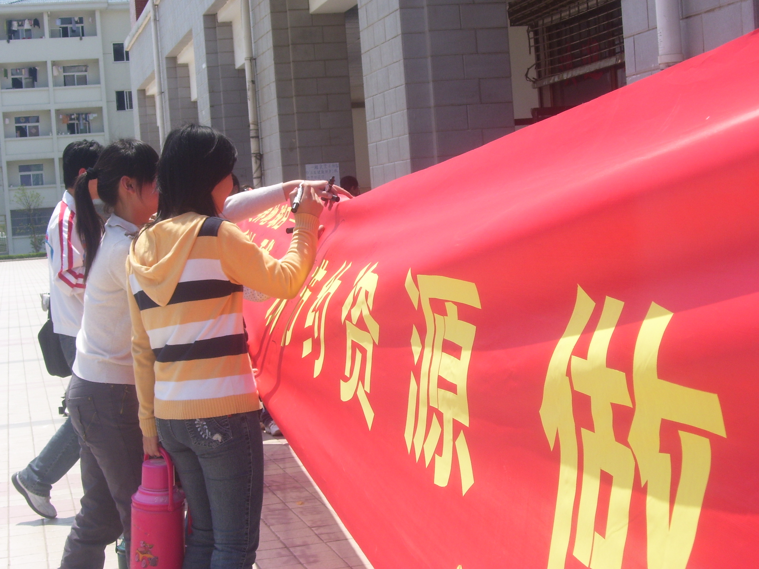 4月20日中午12:00,以“善待地球——从节约资源做起”为主题的大型签名活动在一食堂门前拉开帷幕。在十米长的横幅上,几百名莘莘学子签名纪念。