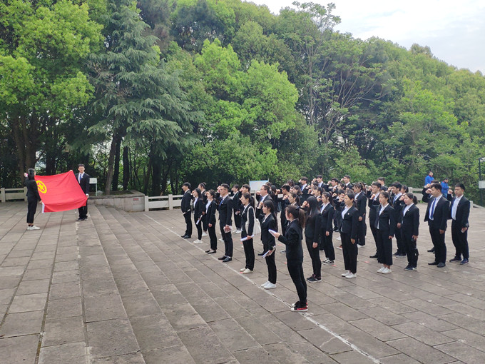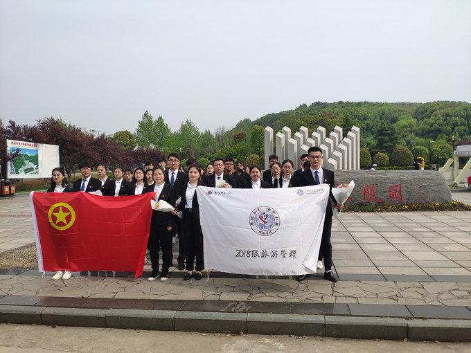 4月13日上午七时许,2018级旅游管理专业全体团员于校花津大礼堂门口集合,同学们整齐划一地身着院服,在相互帮助下认真地佩戴上团徽,手捧鲜花分组列队点名,有序乘车前往烈士陵园,无一人迟到、无一人掉队,为此行奠定了庄严而又神圣的基调。