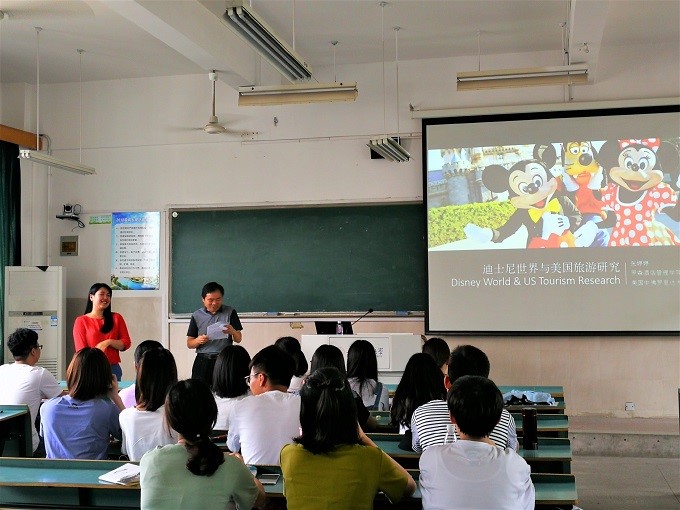 张婷婷以《迪士尼世界与美国旅游研究》为题,生动幽默的为同学介绍了奥兰多迪士尼世界的整体概况以及旅游发展详情;深入透彻的分析了迪士尼吸引力和创新力来源;通过比较我国主题公园发展与美国迪士尼世界发展,分析我国主题公园行业的优缺点,让同学更加立体地加深对迪士尼的认识。课堂整体氛围活跃,张婷婷非常注重与同学的交流。在提问互动环节,同学们踊跃发言,表达自身观点,提出相关问题,与张教授深入沟通。