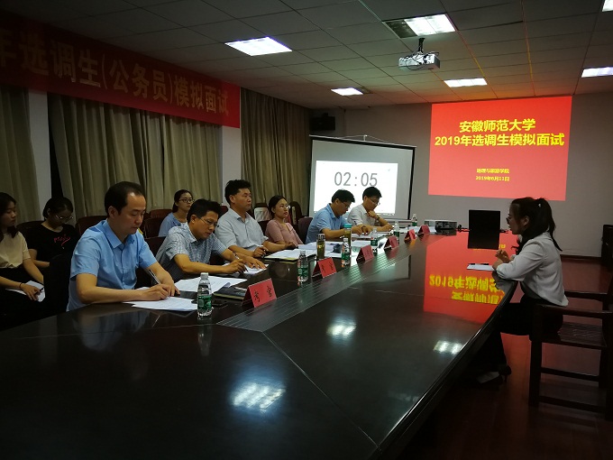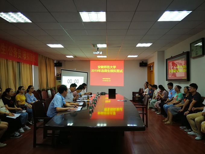 2019年选调生及公务员模拟面试在院行政楼三楼会议室举行。校党委常委、统战部部长王如意,党校常务副校长、党委组织部副部长谢超峰,资产与实验室管理处处长台启权,法学院执行院长严宏教授等担任面试考官,本次活动还特别邀请到我校优秀选调生校友代表、芜湖市镜湖区委组织部副部长王媛媛参加并担任考官。来自文学院、色情动漫
