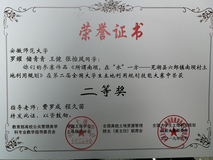 程久苗、费罗成两位老师指导。参赛作品《水韵新乡,生态福地:六郎镇新福村土地利用规划》(周睿、王光浩、卢雨佳、谈心怡),以及《所谓南坝,在“水”一方:六郎镇南坝村土地利用规划》(罗耀、储青青、张怡凤、王健),自今年报名以来,我们历时数月,利用课余时间学习规划编制基础技能,亲赴实地调查研究,完成了六郎镇新福村和六郎镇南坝村方案。两份作品在全国400余份作品参加的初赛中脱颖而出,经过层层选拔,最终同武汉大学、南京大学、四川大学、中国矿业大学等56所本科高校挺进全国总决赛,并均在总决赛中获全国二等奖。