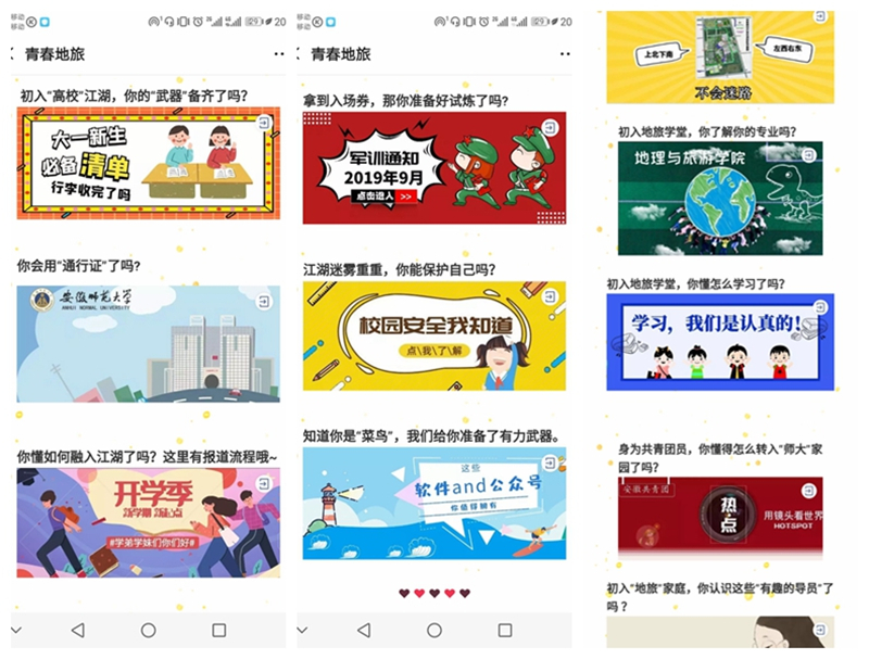 。在校园导游过程中,志愿者与2019级新生或手拿小红旗,或脸贴国旗,在学校标志性地点,如敬文图书馆、敬文碑前,参与“我和国旗同框”合照活动。一起挂起国旗,祝福祖国。此外,学院报到点处放置一块显示屏,以无人机拍摄的视频展示校园全景和特色景观,新生导游们面带微笑,热情地向新生和家长们介绍学校概况。此次迎新生活动中,色情动漫