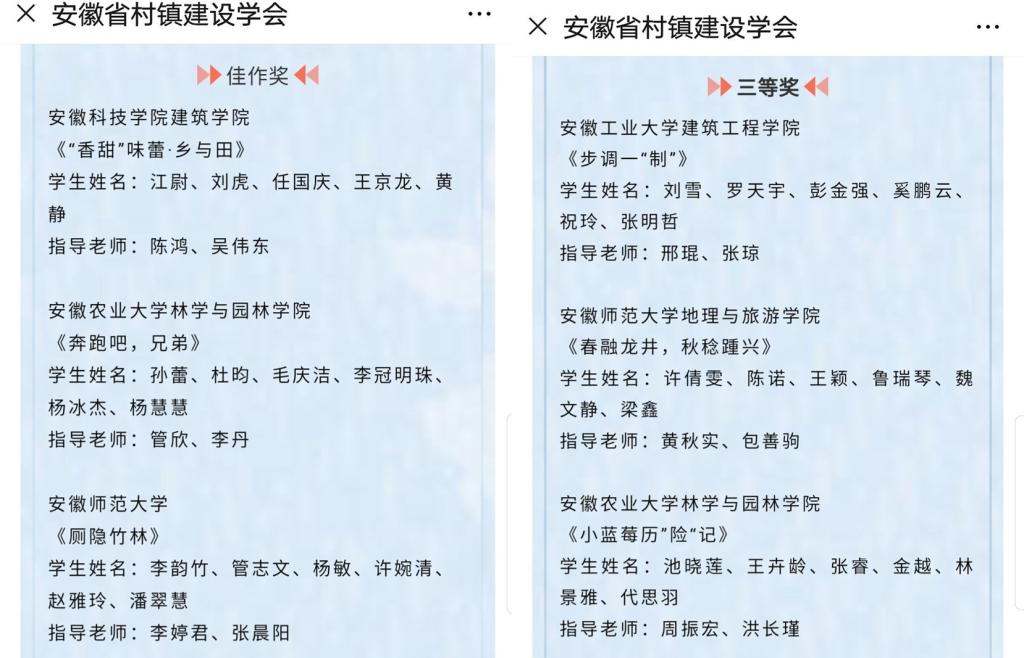 上午9点50分,2019年安徽省高校城乡规划专业乡村规划联合设计方案竞赛比赛公布结果,我校李韵竹、潘翠惠、管志文、杨敏、许婉清、赵雅玲同学的作品《厕隐竹林》荣获佳作奖,许倩雯、陈诺、鲁瑞琴、王颖、魏文静、梁鑫同学的作品《春融龙井,秋稔踵兴》荣获三等奖,入围国家赛。下午5点,安徽省乡村规划联合设计颁奖仪式暨交接仪式隆重举行,杨兴柱教授代表学校从安徽农业大学代表老师手中接过2020年全国大学生乡村规划方案竞赛承办权。