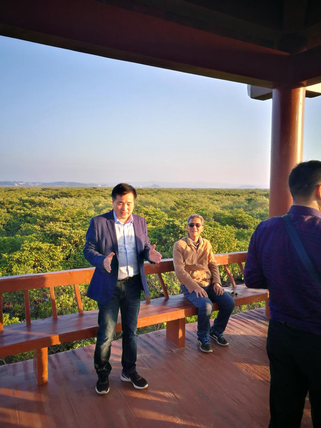 在北仑河口红树林自然保护区,大家走上滨海栈桥近距离观察红树林海岸。曾教授向大家介绍了广西红树林的常见物种,分析了红树物种在海洋咸水环境下的生存策略,强调其在护岸保滩、促淤助涨、降低沿岸泥沙流容量等方面的重要意义。红树林作为一种重要的湿地类型,其在保护遗传、物种和生态系统多样性,维护海洋生态平衡具有重要作用。