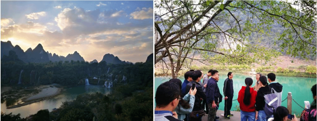 中越边境的德天跨国瀑布,曾教授对该区域的地质背景、岩层岩性特征等进行了讲解。并对喀斯特地貌中的峰丛、峰林谷地、跌水等地貌的成因机制进行了详细分析,对德天跨国瀑布中梯级现象进行了科学解释。现场与学员们就有关问题进行了讨论,并回答学员们提出的问题。
