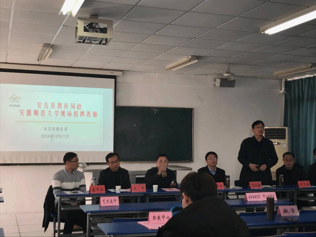 实验楼203教室进行校园宣讲,安吉县教育局组织人事科密良军就安吉县教育局以及各中小学、高职院校发展与人才需求做简要讲解,各学校校长分别介绍了校园文化,重点强调了招聘方式。针对学生提出的问题,各学校校长也做出了详细解答。宣讲结束后,到场的同学纷纷投递了个人简历,各学校分教室进行单独面试与试讲环节。12日上午,安吉县教育局各学校在203教室进行了签约仪式。