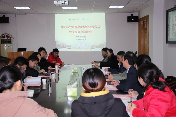分享会上,获奖受助代表2017级城乡规划专业李真、2019级地理科学(拔尖人才班)樊敬贤、2018级旅游管理专业蔡淑玉、2017级地理科学专业罗勇先后分享了她们的青春奋斗故事。“道阻且长,行则将至”,李真同学表示虽然家庭经济困难坎坷,但在学校学院以及97旅本的学长学姐的帮助下,她会坚持不懈走下去,相信一定能够获得最终成功;“鹏程万里,万里可期”,2019级地理科学(拔尖人才班)樊敬贤同学作为新生,用雄心壮志的奋斗理想表达了自己对未来的无限期待和努力决心;2018级蔡淑玉分享了自己“在奋斗中闪光的”青春故事,2017级地理科学专业罗勇同学讲述了自己在学校学院领导老师和社会各界的关怀帮助下,执着追求科研梦想,参与国家青藏高原科学考察学习实践,并撰写发表多篇高水平论文的励志故事。四位发言人讲述自己的成长故事,抒发对学院和97旅本学长学姐们的感谢之情,纷纷表示自己会怀揣一颗感恩之心,继续前进。