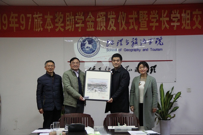苏勤代表学院对97旅本奖助学金共同资助人表示感谢,他高度肯定了该项奖助学金设立的意义,并鼓励获奖受助学子要饮水思源,学会感恩与担当,刻苦学习,努力深造,报效祖国,让青春在奋斗中闪光。最后,贾冠忠、苏勤代表学院将2018级城乡规划专业学生精心设计制作的皖南写生作品《百村山居图》赠送给97级旅游管理班级,以表感谢之情。
