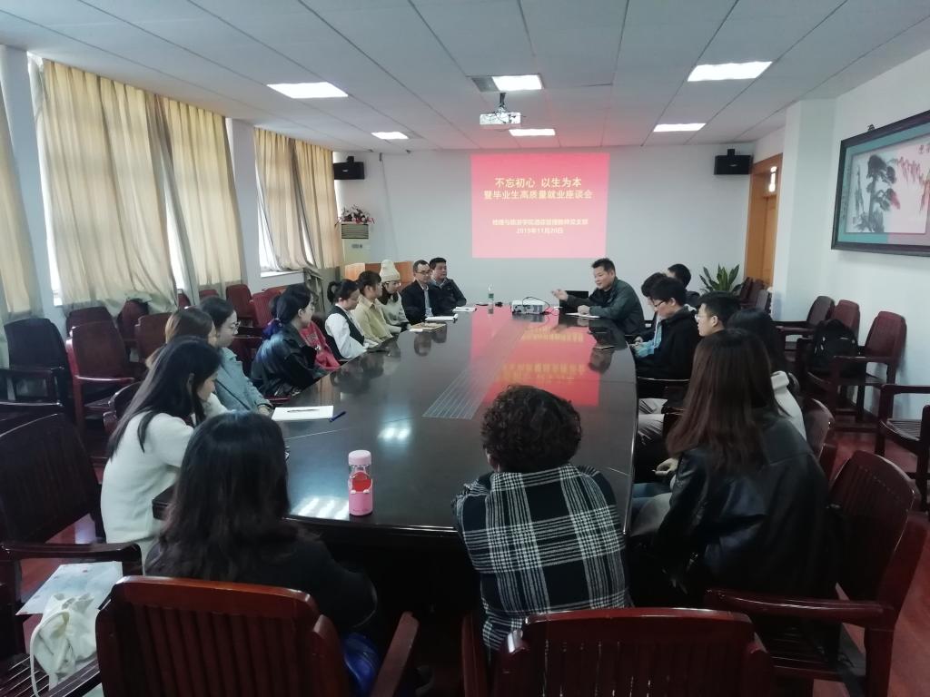 酒店管理专业教师党支部认真组织支部党员同志开展讨论和学习,坚持以立德树人为目标,以做“四有”好老师,当好“四个引路人”为重点,聚焦问题抓落实,于近日召开了“不忘初心·以生为本”暨2020届酒店管理专业毕业生高质量就业座谈会。学院党委副书记乔静,全体酒店管理党员教师和毕业生参会。会议由党员教师张伟主持。