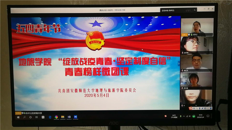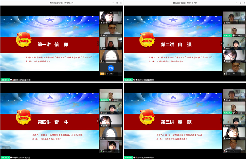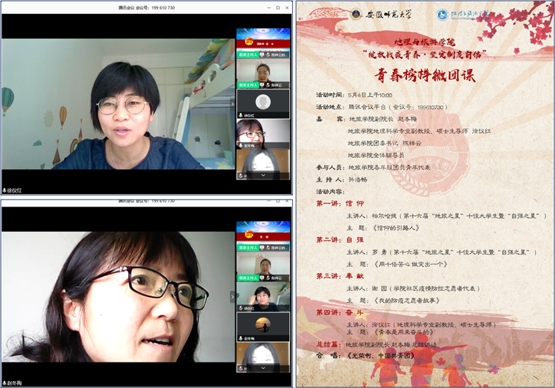 副院长赵冬梅,地理科学专业教授、硕士生导师徐仪红,院团委书记陈祥云,学院全体辅导员,以及240余名学院团员青年代表参与线上微团课。本次微团课由2018级地理科学(非师范)专业孙浩畅主持。