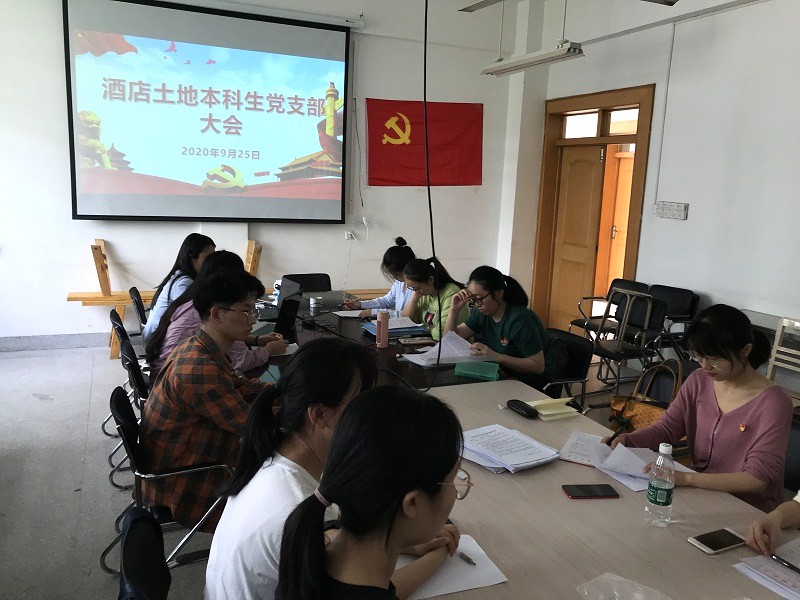酒店土地本科生党支部于行政楼1楼旅游教研室召开党支部大会,讨论关于章淑敏等5位同志申请转为正式党员的问题。会议由党支部书记王美主持。