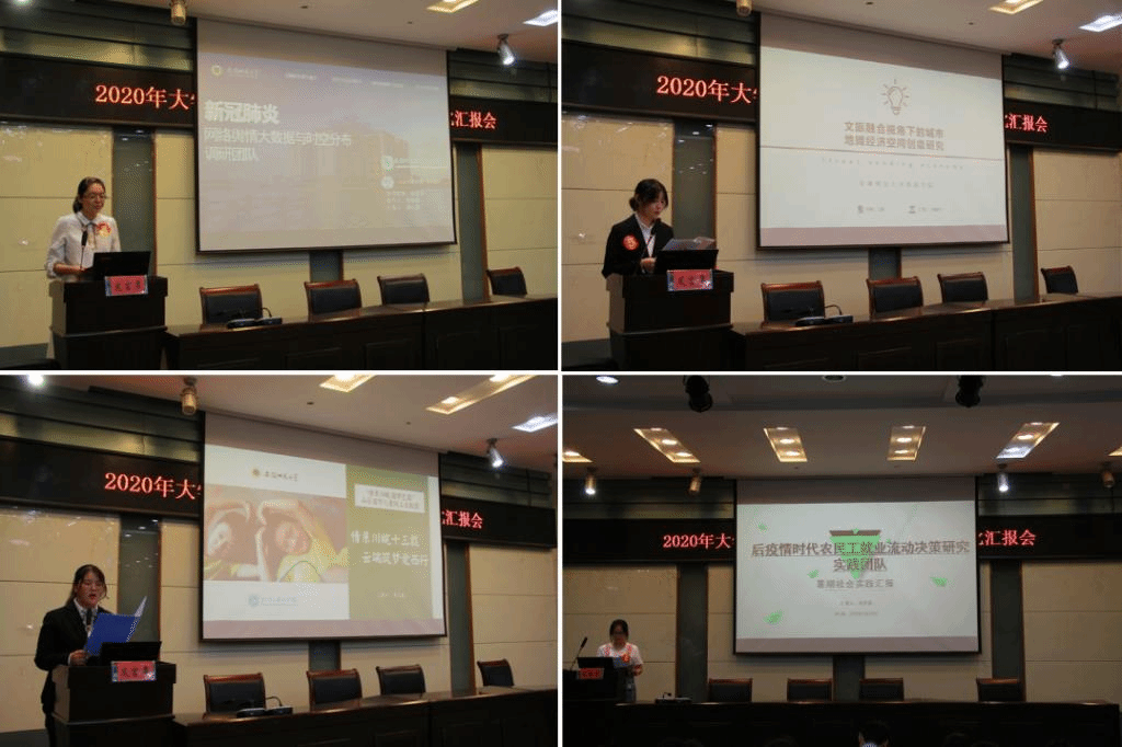 “情系川皖·圆梦巴蜀”山区留守儿童线上支教团队不忘初心,步履不停,连续13年传递爱的火炬,受疫情影响“云端”开展支教活动,特别增设防疫知识宣讲、安全知识宣讲,为孩子普及疫情防控牺牲烈士英勇事迹,培养孩子们的爱国意识;农业转移人口市民化调研团队从乡村、城市两部分开展调研,从人民群众视角看待问题,比较相关性分析并得出结论;安徽省后疫情时代农民工就业流动决策研究实践团队分析新冠肺炎疫情影响下的农民工就业的不确定性问题并得出心得感悟。街道防疫、抗洪筑堤、情系川皖、寻觅徽韵、探鹞落坪……每支队伍都各具特色,调研成果颇丰。