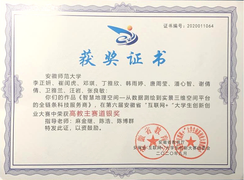 本网讯(地旅学院 李正妍)近日,由安徽省教育厅与合肥市人民政府联合主办,合肥工业大学、合肥学院、合肥职业技术学院和合肥市教育局共同承办的第六届中国国际“互联网+”大学生创新创业大赛选拔赛暨安徽省“互联网+”大学生创新创业大赛圆满落下帷幕。2017级地理信息科学专业李正妍、崔闰虎、2018级地理信息科学专业邓琪等同学,在我校色情动漫