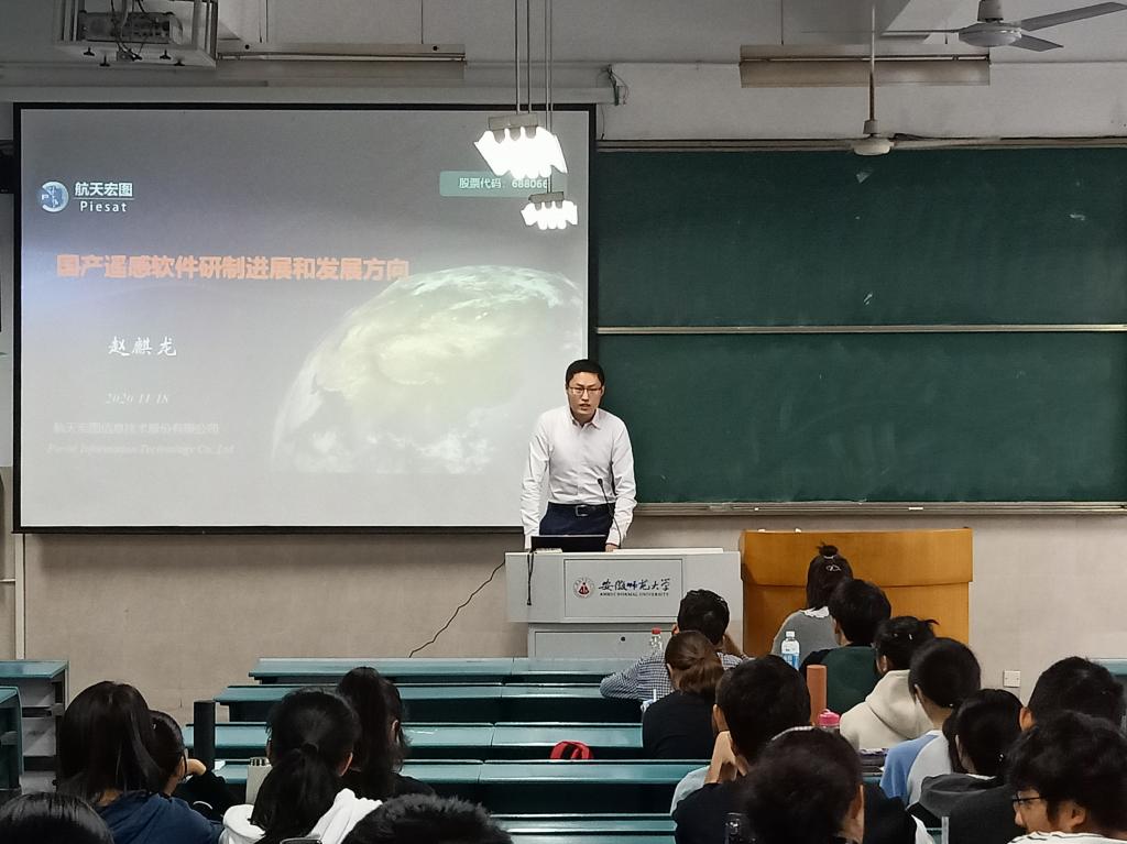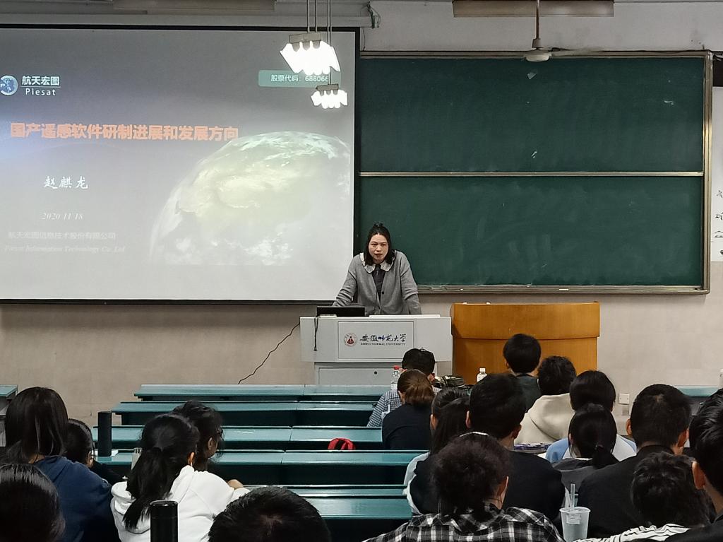 副教授齐凌艳主持,航天宏图研究院技术总监赵麒龙主讲,2018级地理信息科学专业以及2019级地理信息科学专业全体同学参与。