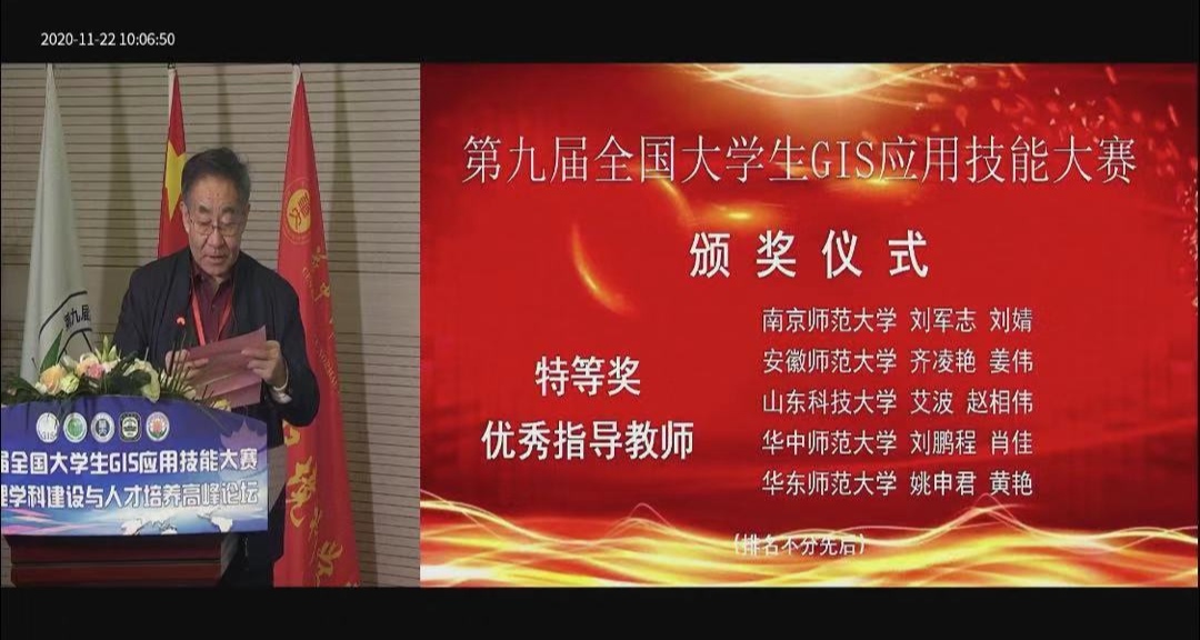 地理信息科学专业副主任齐凌艳副教授、青年教师姜伟博士指导,2018级地理信息科学专业学生丁雅欣、孙雯杰、张帅、翁泽锋组成的团队从来自全国151所高校的154支参赛队伍中脱颖而出,以总决赛排名全国第二的突出成绩荣获全国特等奖,取得了我校学子在该项赛事上的历史性突破,指导教师齐凌艳、姜伟获得大赛“特等奖优秀指导教师”荣誉称号。