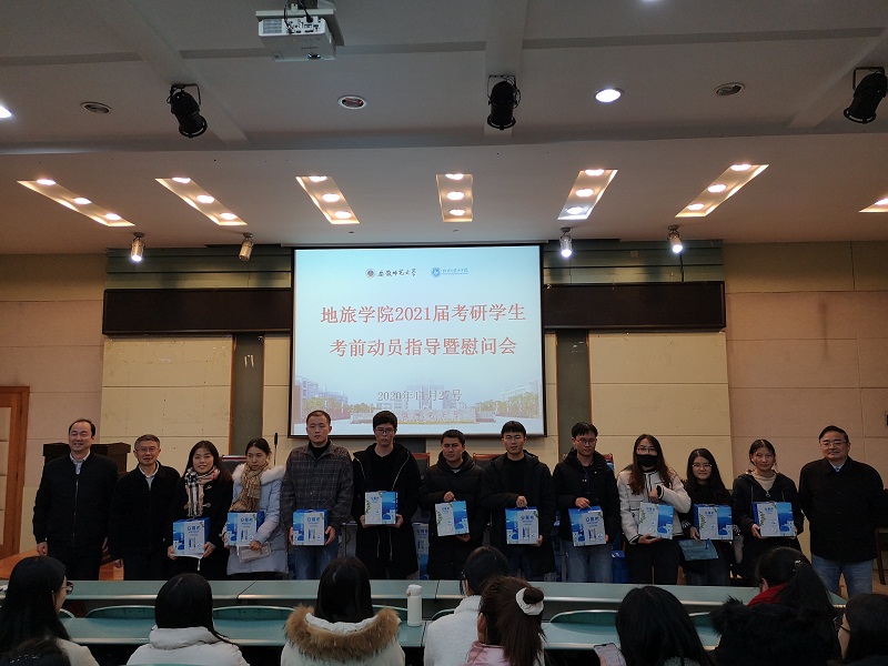 2021届考研学生考前动员指导暨慰问会。院党委书记贾冠忠、院长苏勤、院党委副书记乔静、2017级辅导员全体辅导员以及2021届考研学生参加了动员慰问会。会议由院党委副书记乔静主持。
