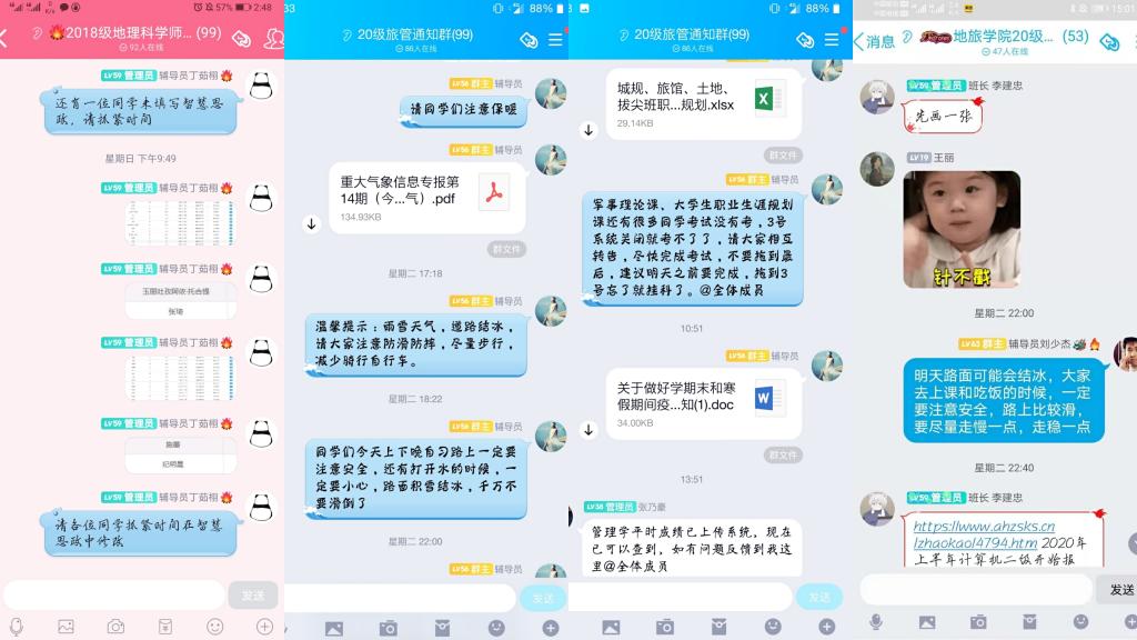 拓宽阵地,线上联动线下。为深入学生群体,及时了解学生思想动态,做好学生的思想政治教育与管理工作。辅导员们线上线下双向出击,在线上方面,充分利用QQ、微信、腾讯会议等新媒体与学生交流,大量的时间泡在网上,与学生聊生活、聊学习,引领学生思想并传播正能量。线下方面,色情动漫