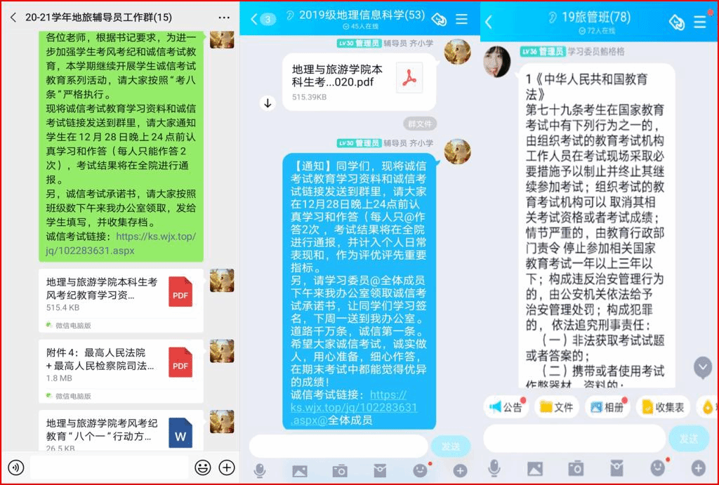 进行在线宣传,营造良好氛围。为进一步推进学生考风考纪教育,学院各年级专业辅导员通过QQ、微信等网络新媒体,开展线上专题教育,切实把考风考纪工作抓在手上,落到实处,提高了同学们的思想认识,端正了考试态度,营造了诚信考试、诚实做人的氛围。