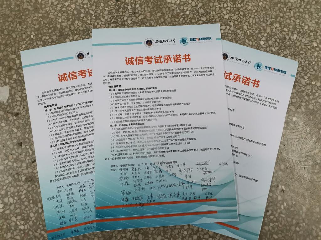 承诺诚信考试,规范考试纪律。为进一步实现“零作弊、零违纪”的目标,学院各班级在传达学校、学院诚信考试文件精神的基础上,所有学生认真阅读了诚信考试承诺书,对个人、班级、学院、学校作出承诺,践行诚信考试承诺,自觉遵守考场规定,杜绝违规违纪行为的发生。