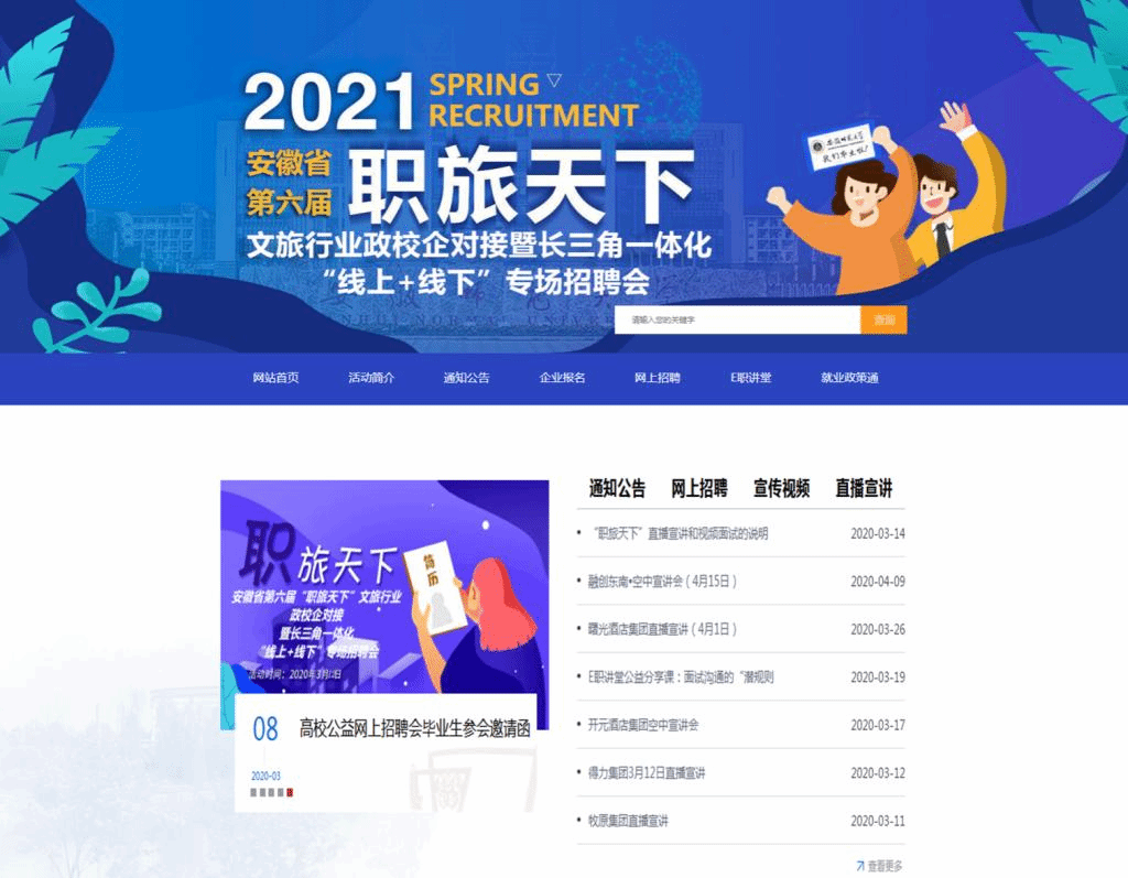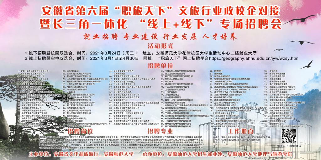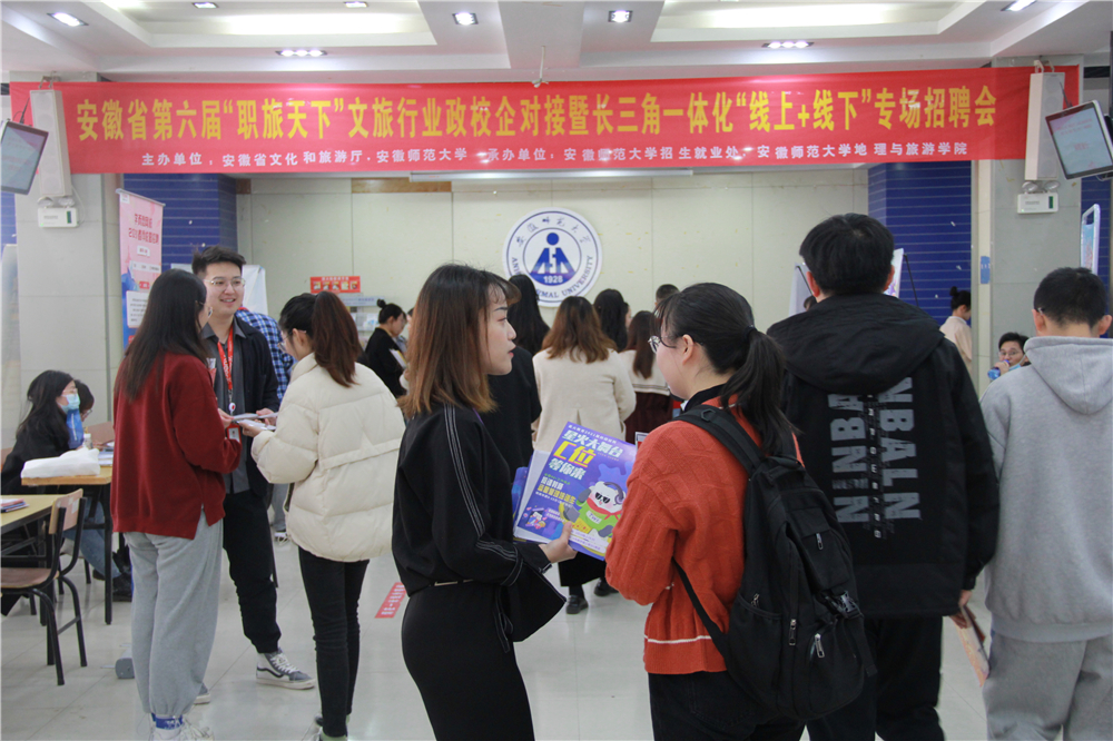 承办的安徽省第六届“职旅天下”文旅行业政校企对接暨长三角一体化“线上+线下”专场招聘会由我校成功举办。来自全国各地的120余家企业通过线下线上来校招贤纳士、选聘英才,6000多个招聘岗位涉及文化、旅游、教育、科技等多个门类,涵盖世界和中国500强、中国旅游集团20强、中国文化企业品牌价值TOP50等多个业态。招聘会吸引了全校及周边高校毕业生的积极参与。