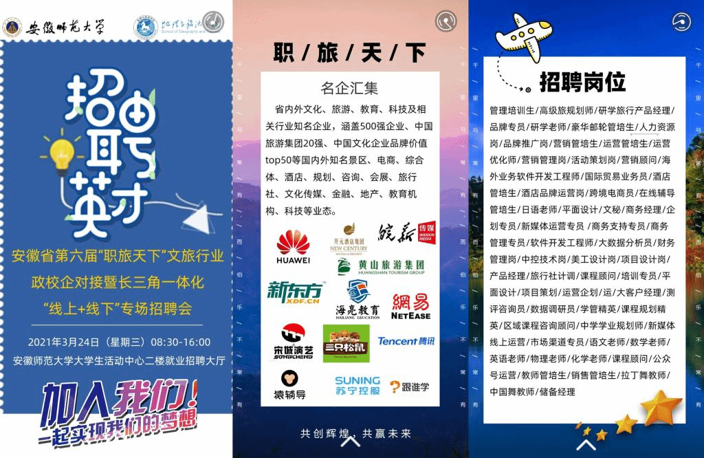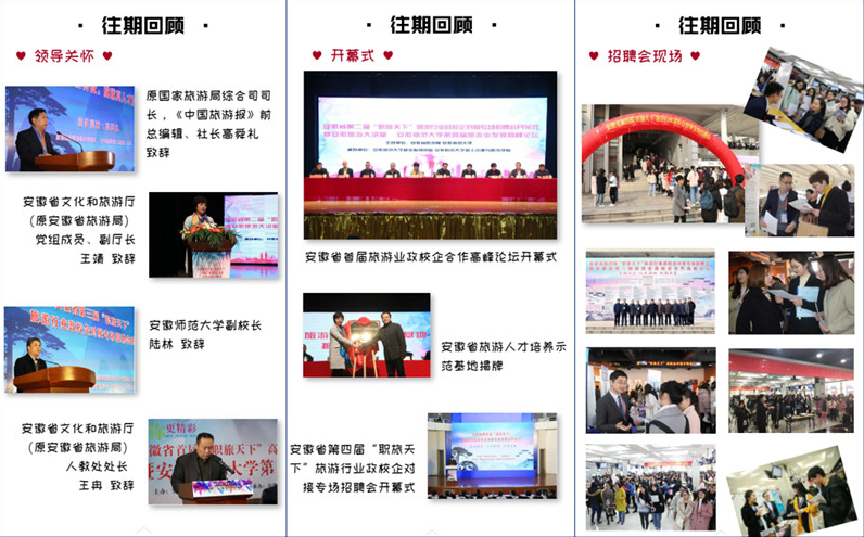 据悉,“职旅天下”系列活动自2013年创办至今,已吸引800余家文化、旅游及相关行业知名企业,3万余人次毕业生参与,推进了安徽省旅游院校与政府、企业的交流融合,校地合作、校企合作、“洲际”英才学院、“开元”订单班等一批政校企合作项目开花结果,一批创新创业项目和教学成果奖项应运而生,积极推动了各高校旅游及相关专业毕业生就业工作。“职旅天下”活动已成为安徽省乃至华东地区“起步最早、规模最大、影响最广”的高校旅游行业政校企合作重要平台和就业品牌之一,活动相继受到新华网、国家旅游局官网、《中国旅游报》《安徽日报》等新闻媒体的广泛报道。今年,为主动应对新冠肺炎疫情防控形势,积极响应教育部有关工作要求,活动首次采取“线上+线下”同时进行的形式举办高校文化和旅游专场招聘会,助力疫情防控常态化背景下的高校就业工作,服务长三角高质量一体化发展国家战略和全面建设现代化五大发展美好安徽奋斗目标。