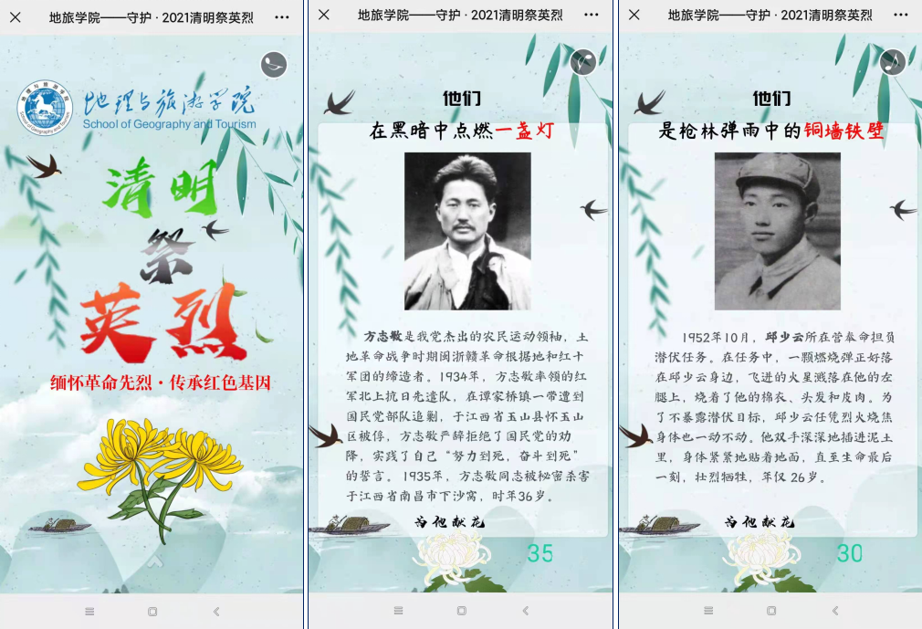 地旅学院党团员青年积极将中华民族慎终追远的情感融入现代文明的表达方式,强化精神文化传承,在“皖事通”APP开展清明“云祭祀”。并制作“云祭奠”H5网页,组织学生在“云端”为革命先烈鲜花致敬。