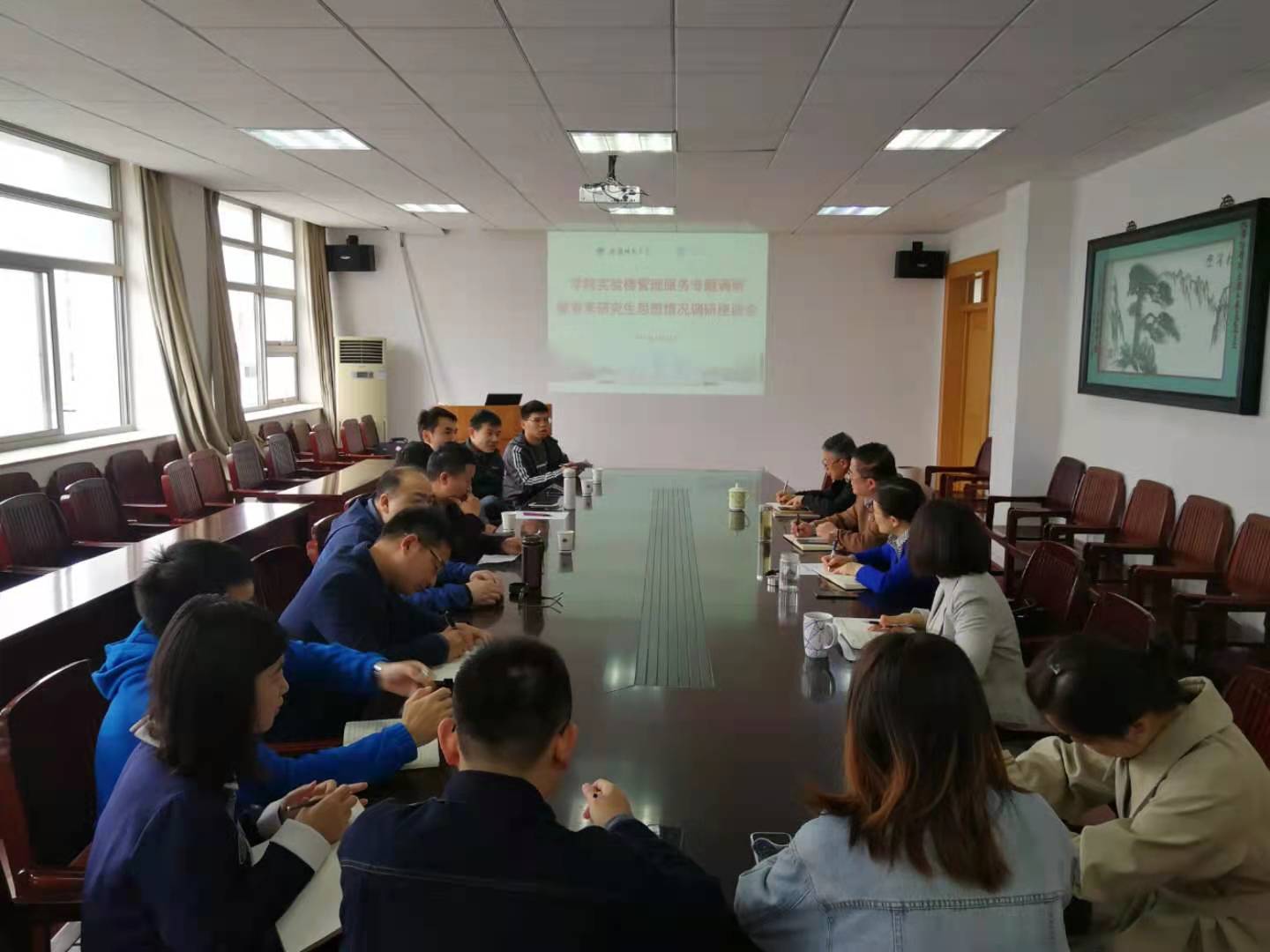 在院行政楼三楼会议室召开实验楼管理服务专题调研暨春季研究生思想情况调研座谈会,学院领导班子成员、教研室主任、教师和研究生代表参加座谈会。会议由院长苏勤主持。