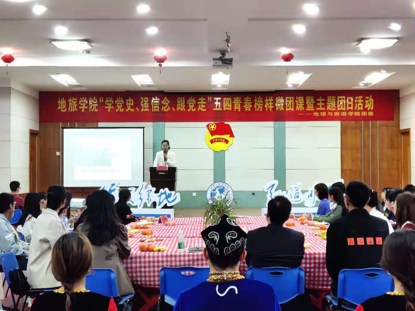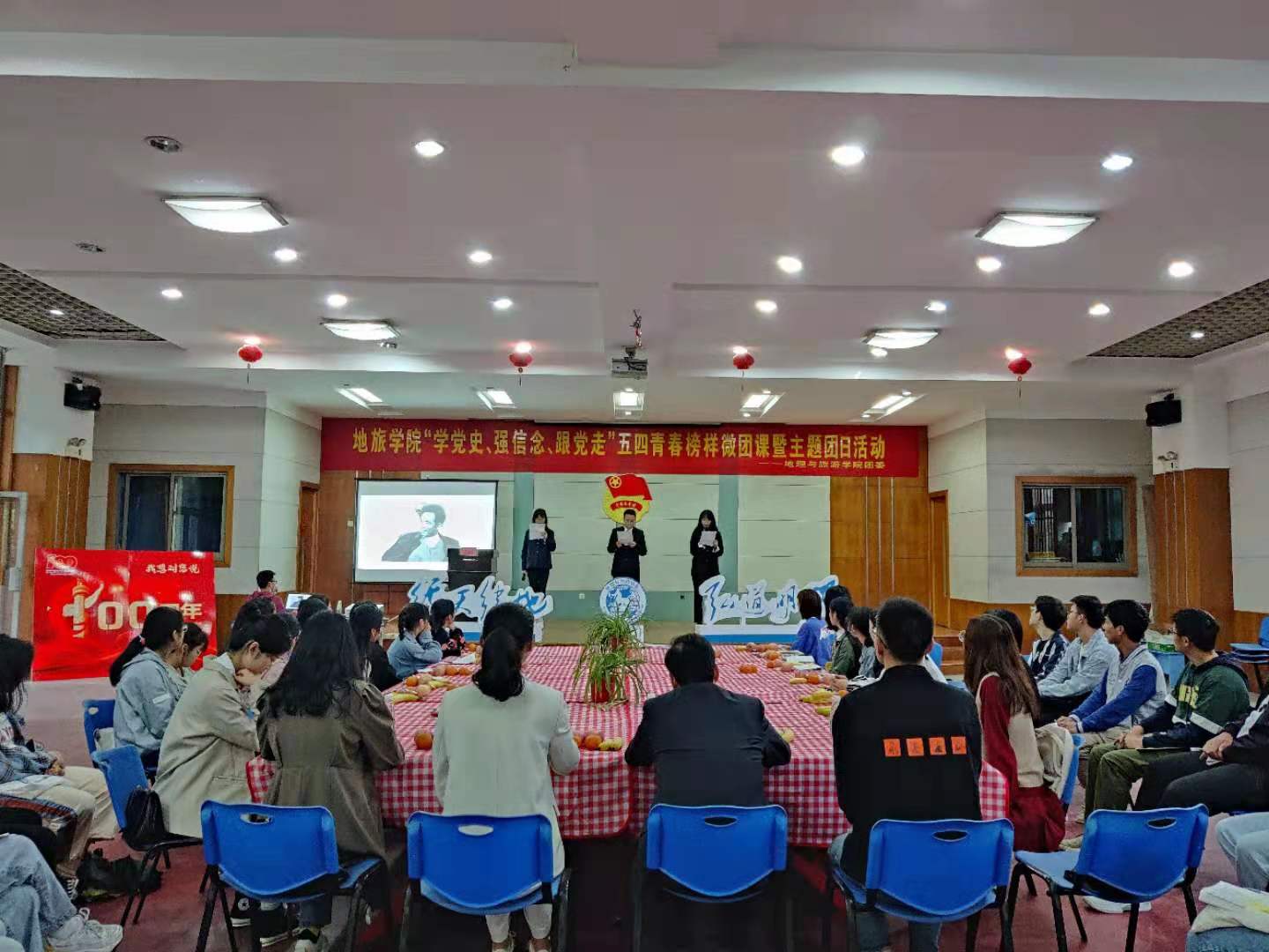 团委书记陈祥云主持。本次五四青春榜样微团课分为三讲,分别是:热血、榜样、奋进。三讲课程中间有两次课间表演:分别是新疆舞和诗朗诵。