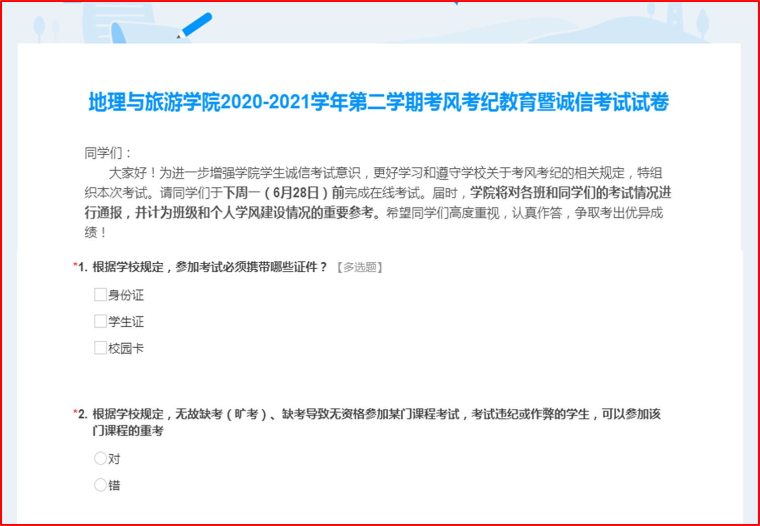 开展线上测试,强化诚信意识。为进一步巩固前期考风考纪暨诚信考试教育的成果,学院扎实开展考风考纪教育暨诚信考试线上测试,并把考试成绩作为班级和学生个人学风建设的重要参考,对所有参加考试学生的成绩进行写实性通报,让学生牢固树立起诚信考试的思想意识。