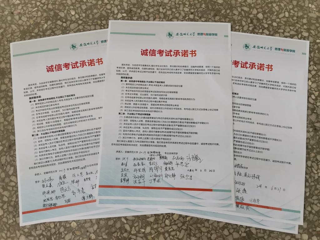 承诺诚信考试,规范考试纪律。为进一步实现“零作弊、零违纪”的目标,学院各班级在传达学校、学院诚信考试文件精神的基础上,所有学生认真阅读了诚信考试承诺书,对个人、班级、学院、学校作出承诺,践行诚信考试承诺,自觉遵守考场规定,杜绝违规违纪行为的发生。