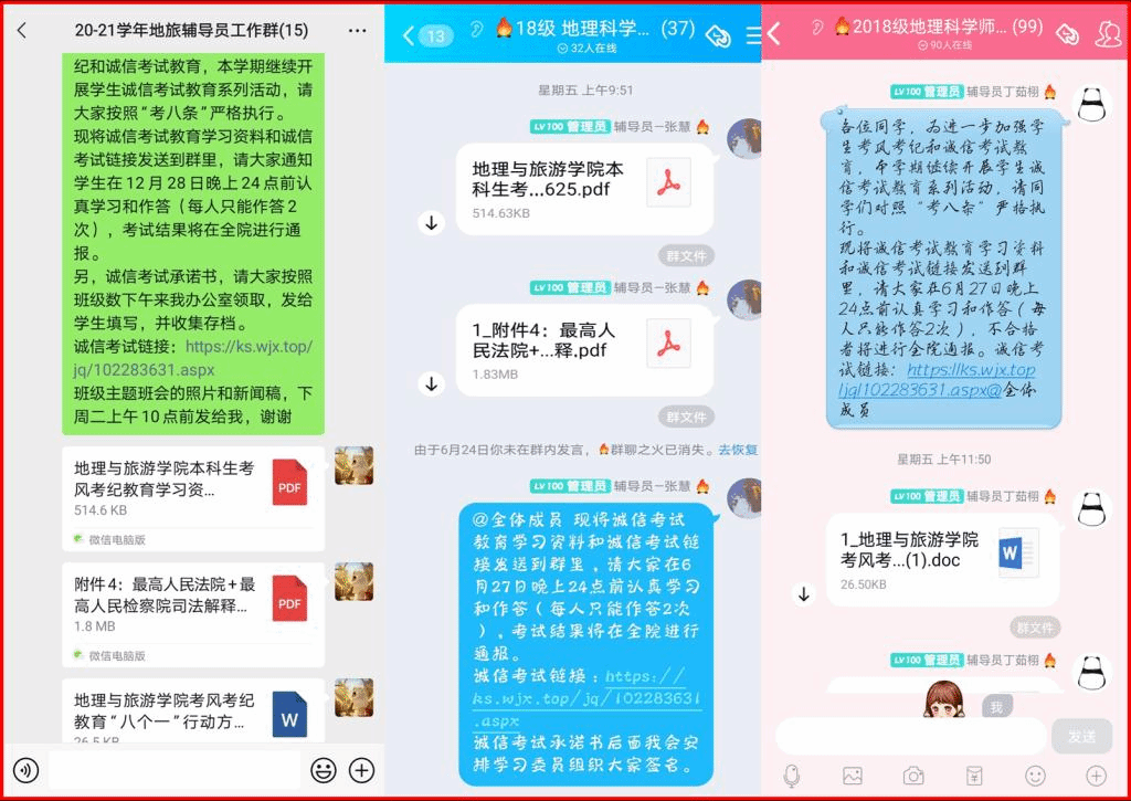 进行在线宣传,营造良好氛围。为进一步推进学生考风考纪教育,学院各年级专业辅导员通过QQ、微信等网络新媒体,开展线上专题教育,切实把考风考纪工作抓在手上,落到实处,提高了同学们的思想认识,端正了考试态度,营造了诚信考试、诚实做人的氛围。