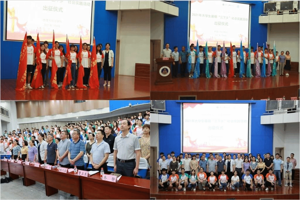 2021年大学生暑期“三下乡”社会实践活动出征暨授旗仪式在敬文图书馆学术报告厅举行。校团委副书记张薇薇,暑期社会实践思政指导教师孙艳秋,院党委书记贾冠忠,院长苏勤,院教授委员会主任程久苗,院党委副书记乔静,副院长方凤满,副院长曹卫东,副院长汪文文,院暑期社会实践团队指导老师代表王群、方叶兵、徐玉婷、王雪微、韩会然、张伟、王莉、姜伟、朱爱萍、朱晓强,以及全体专兼职辅导员、全体暑期社会实践团队队员参加了出征仪式。仪式由院团委书记陈祥云主持。