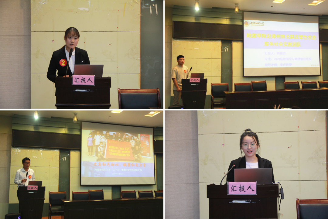 党委副书记乔静,旅游管理专业负责人杨钊、城乡规划专业负责人杨兴柱、土地资源管理专业副主任徐玉婷、地理科学专业副教授方叶兵、地理信息科学专业教师贾蔡,院团委书记陈祥云,学院专兼职辅导员代表担任评委,各年级团支部的20名学生代表担任学生评委。此外,各支社会实践团队队员代表、各年级团支部成员代表到场聆听汇报。