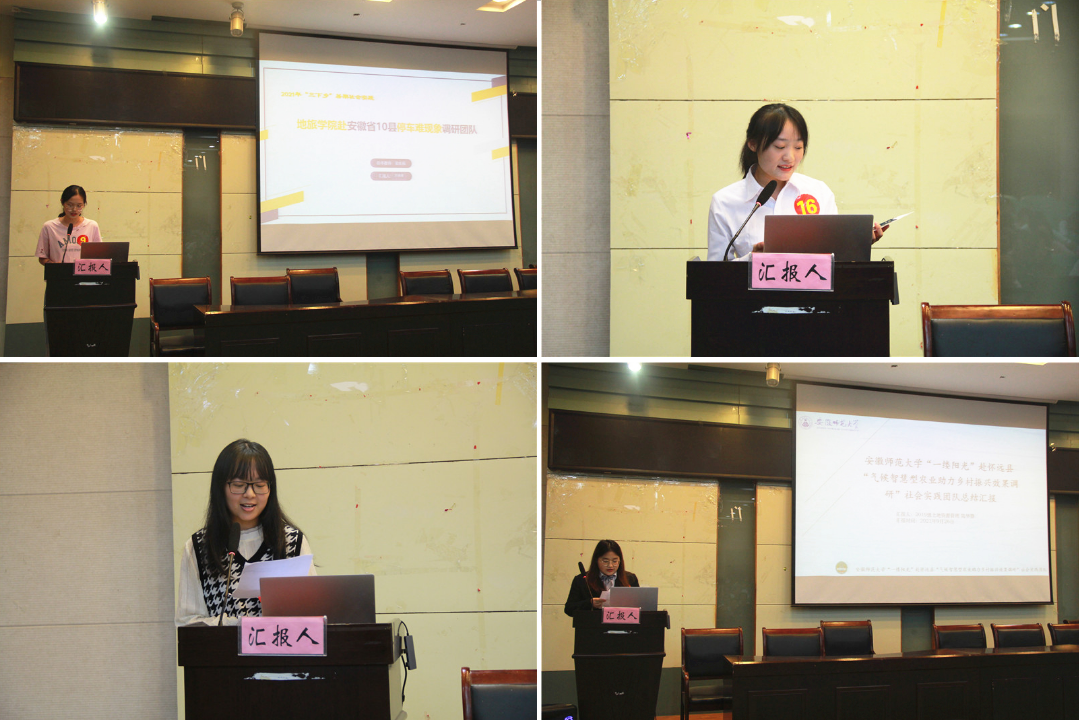 此次汇报会共有16支团队、8个班级团支部参与评比汇报。各汇报人以流畅的讲述与精彩的PPT展示,从整体概况、实践内容、成果展示、心得体会等方面进行汇报,生动形象地汇报了实践学子们暑期实践的参与情况和收获感悟,为评委老师和同学们展现了一幅五彩纷呈的暑期实践画卷。