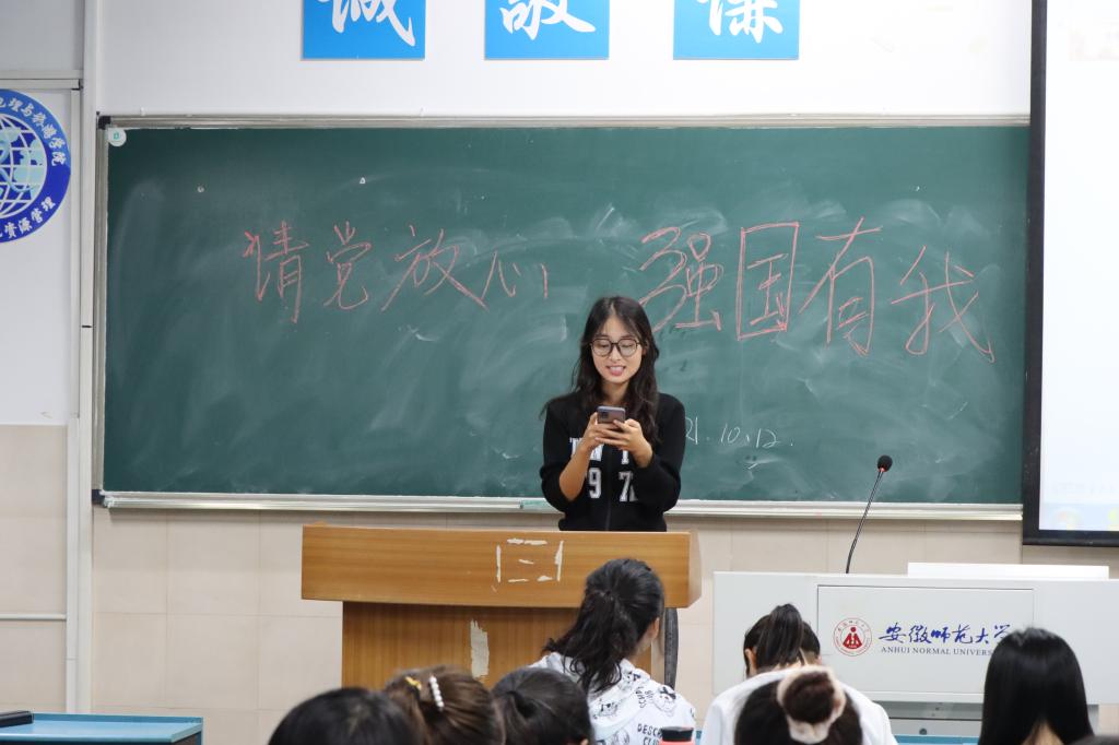 韦银艳 陈谊)为认真贯彻落实习近平总书记在庆祝中国共产党成立100周年大会上的重要讲话精神,进一步引导青年大学生把青春奋斗融入党和人民事业,努力成为实现中华民族伟大复兴的先锋力量,2021级旅游管理专业2班10月12日晚间举行了“请党放心,强国有我”主题团日活动。活动由团支书黄倩主持。