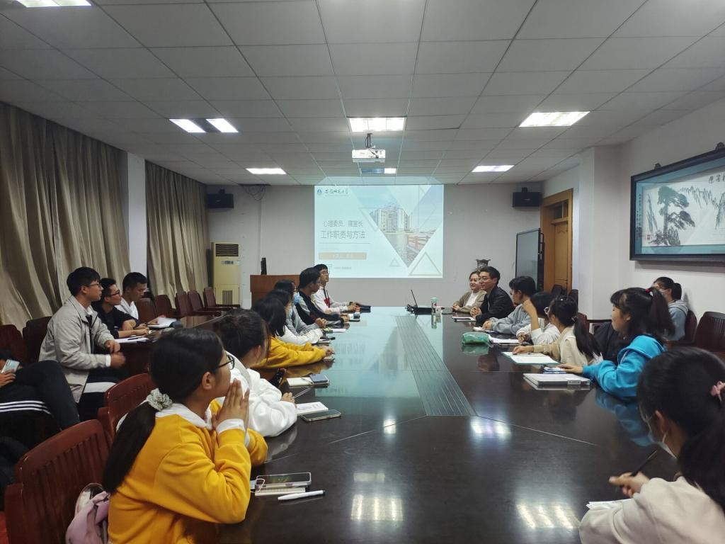 邀请校大学生心理健康教育中心聂余老师为学生骨干做心理专题培训。会议由辅导员韩红豆主持,学院各年级心理委员、安全员和寝室长代表参会。