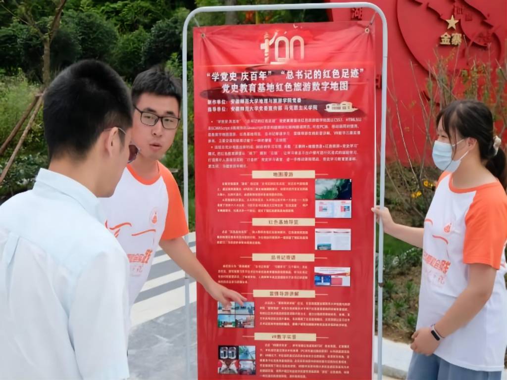 赴多地“总书记的红色足迹”党史教育红色旅游数字地图研发宣传教育实践团队,该团队以学院自主研发的红色足迹数字地图成果为依托,采用“一条主线,多翼联动”的形式利用暑期社会实践广泛开展党史宣传,团队有力促进了基层群众学习党史的渠道和效果。“总书记的红色足迹”数字地图也获得中华人民共和国教育部、中国教育报等国家级官方媒体报道。