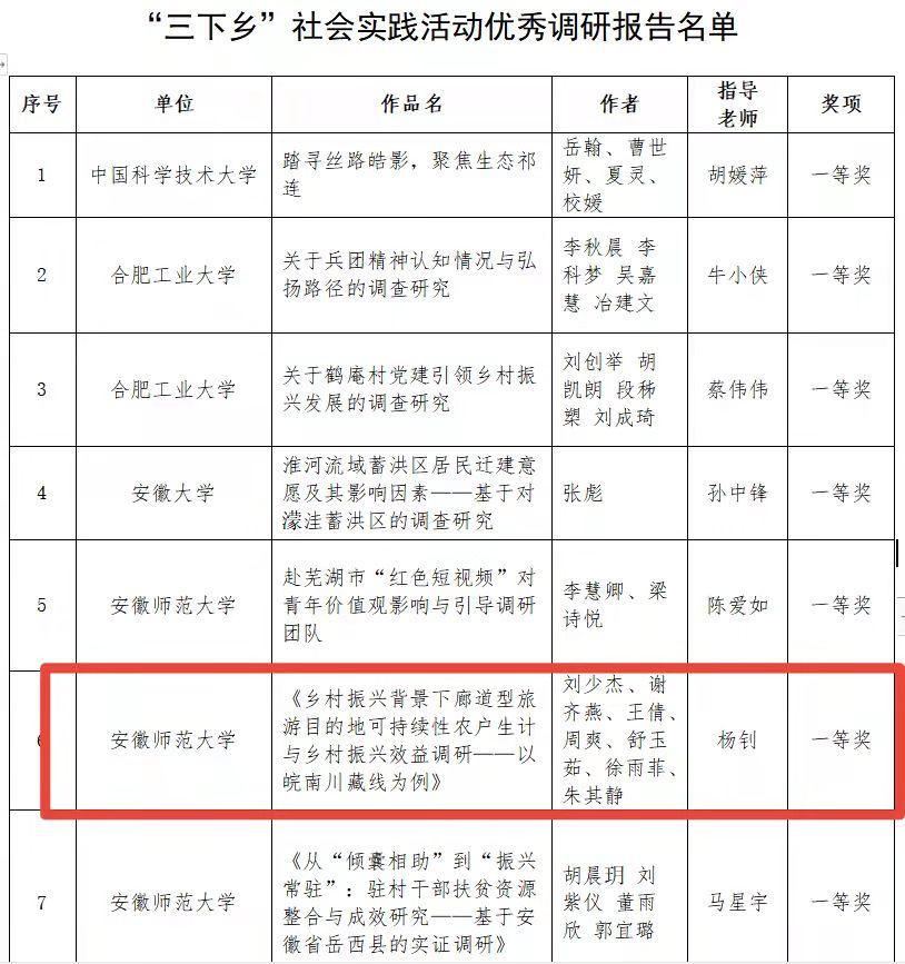 省级优秀调研报告一等奖为《乡村振兴背景下廊道型旅游目的地可持续性农户生计与乡村振兴效益调研——以皖南川藏线为例》,指导教师为色情动漫