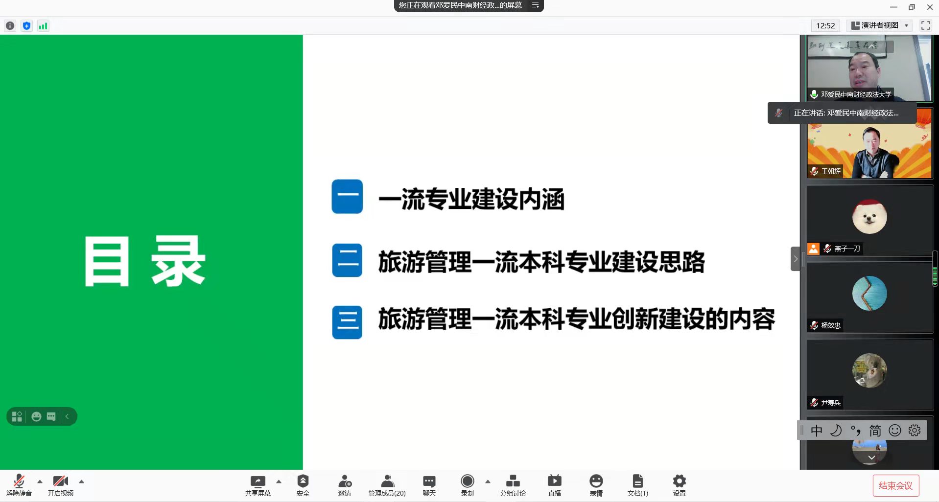 刘少杰) 2月26日上午,教育部高等学校旅游管理教学指导委员会委员、湖北省旅游决策咨询专家、中南财经政法大学旅游研究院院长邓爱民教授做客云端讲授《旅游管理一流专业建设的探索》专题辅导讲座,科研处副处长王朝辉、学院党委副书记乔静、旅游管理专业负责人杨钊以及旅游管理教研室全体教师参加讲座,讲座由科研处副处长王朝辉教授主持。