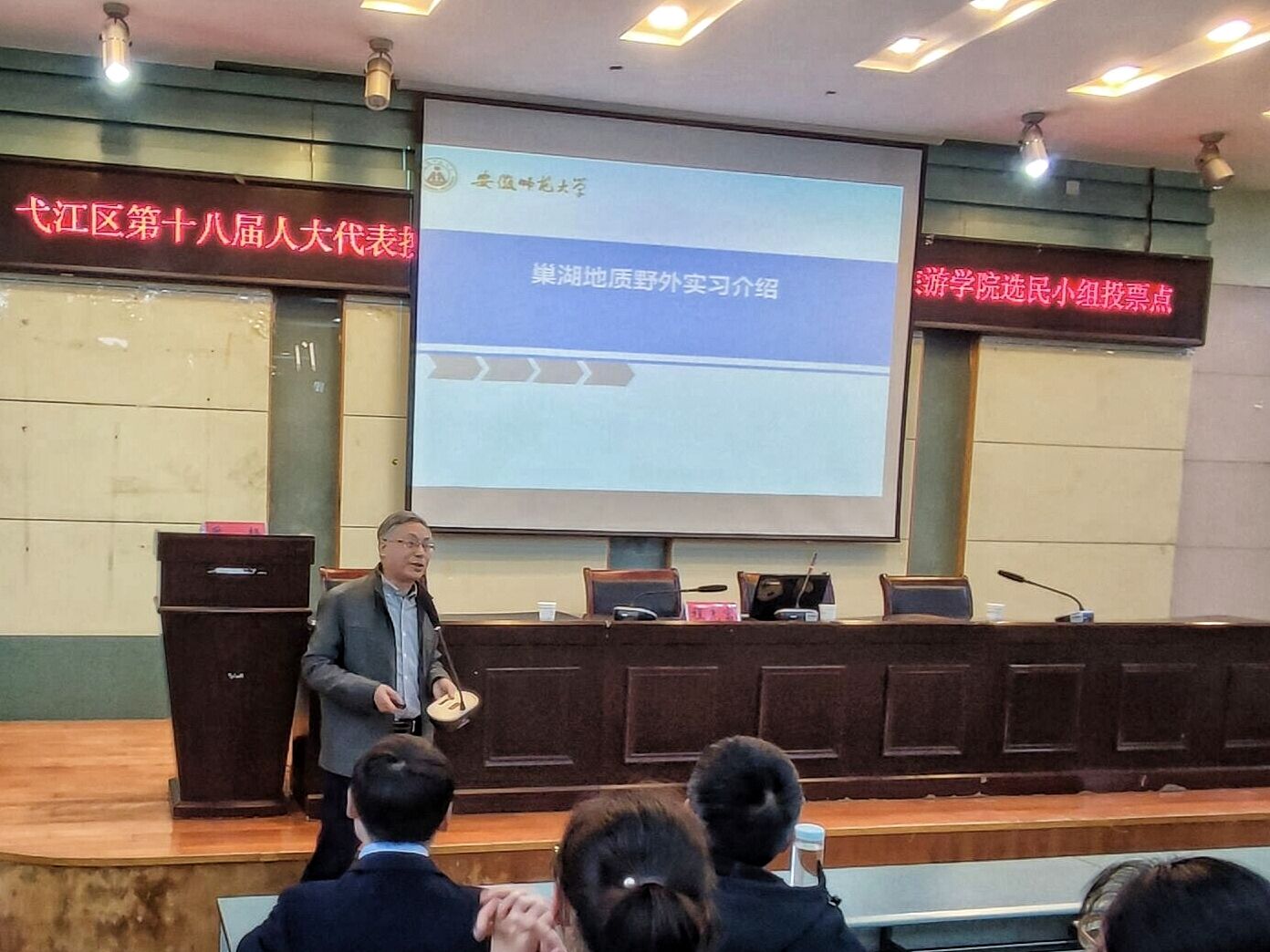 为明确巢湖野外地质实习的目标和任务,确保本次实习圆满完成,3月9日下午,21级地理科学(师范)专业在学院实验楼101报告厅召开巢湖野外地质实习动员会。学院教学副院长杨兴柱、党委副书记乔静以及实习指导教师程先富、杨立辉、朱晓强d等参加会议。会议由辅导员韩红豆主持,21级地理科学(师范)专业全体学生参会学习。