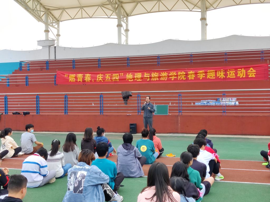 学生会、社团成员在南操场举办“燃青春 庆五四趣味运动会”。运动会开始,学院党委副书记乔静与同学们讲话并致开场词,他首先祝同学们五一劳动节快乐,然后鼓励同学们积极参与、尽情释放运动才能,彰显地旅学子们的青春活力。随后,运动会在动感的音乐节奏和欢乐的手拉手暖场活动中展开,老师和同学们一起汇成同心圆,在主持人的指令中“抱团”组合,欢声笑语不断。随后又陆续分六组竞赛,进行了踩气球、扔绣球、五人六足以及你画我猜(古诗词)趣味活动,运动会项目设置既考验了个体的灵活创意、随机应变能力,也考验了团队的协作互助、默契配合程度。通过积分排序,最终评选出一等奖一组,二等奖一组、三等奖三组,并由乔静给他们颁发了奖品。