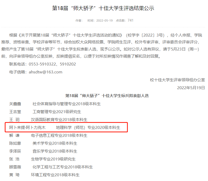 学子阿卜来提·阿卜力克木在评选中获得“师大骄子”十佳大学生标兵荣誉表彰。