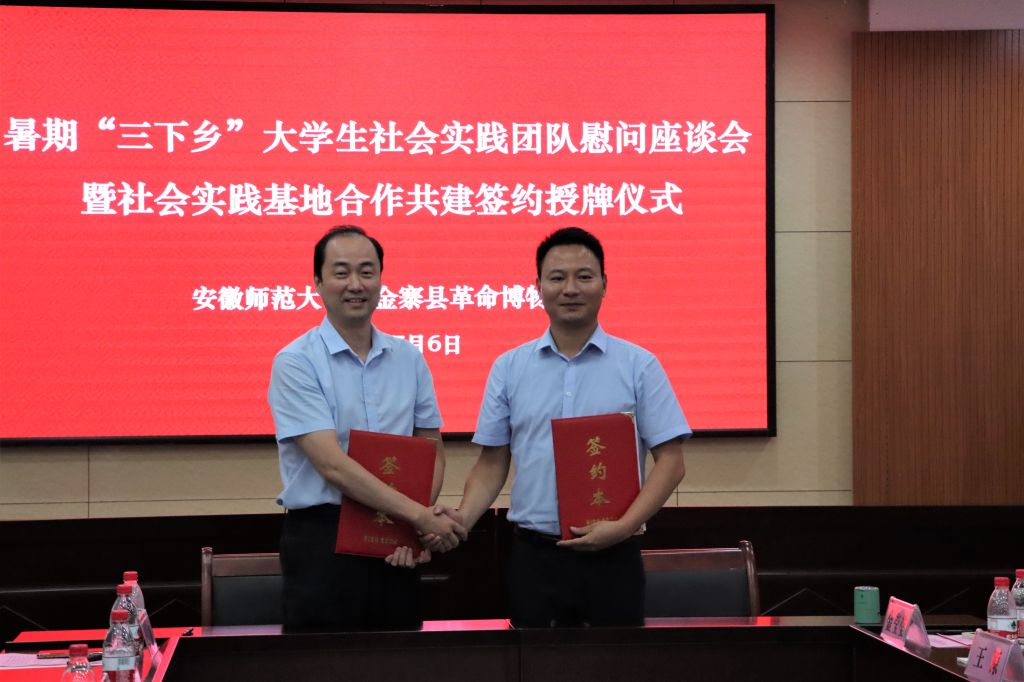 高度重视大学生暑期“三下乡”社会实践活动,自5月启动以来,学院积极动员,精心组织,做好安全教育和组织保障,引导学生围绕社会热点和专业所学,广泛开展丰富多彩的实践活动,积极探索实践育人新机制。此次与金寨县革命博物馆社会实践基地的合作共建,既有助于强化师生党史学习教育,传承红色基因,也有利于汇聚多方资源、发挥基地优势、提升实践育人成效。