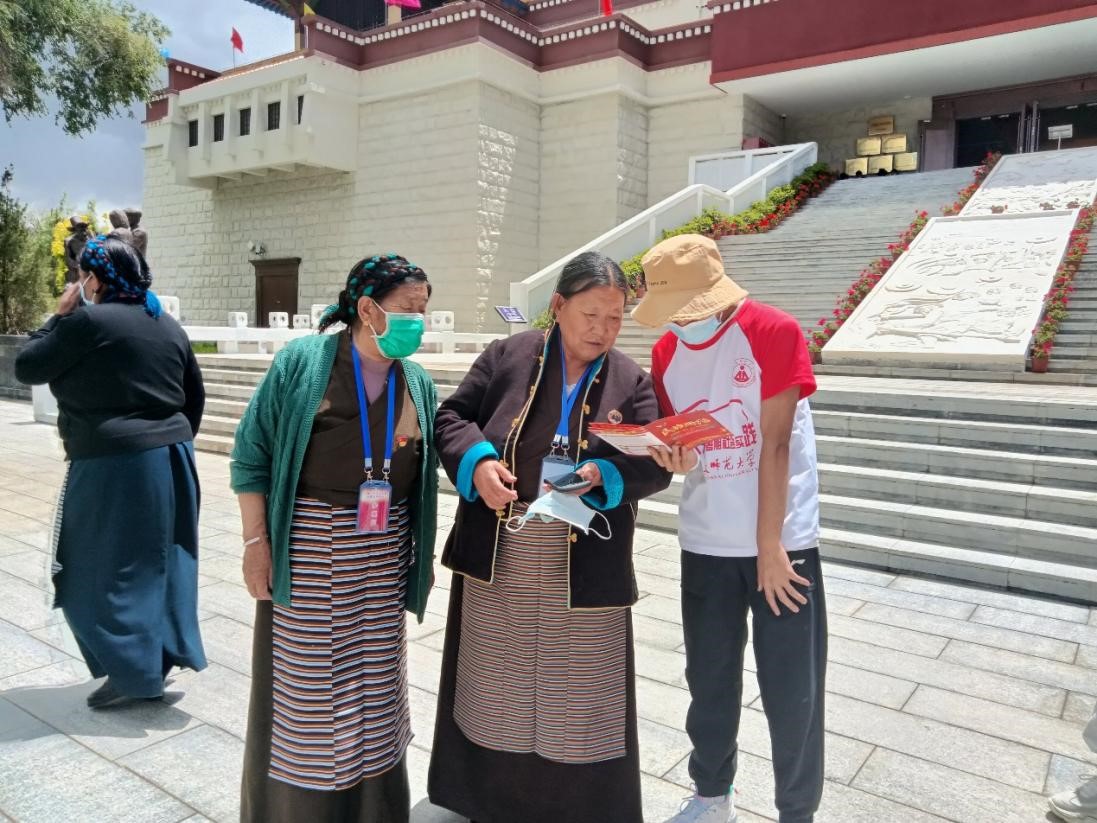 7月1日上午,实践团队来到西藏博物馆。博物馆内人头攒动,恰逢当地公安局在此处开展主题活动。通过沟通交流,他们对队员们利用暑期主动进行民族团结政策宣讲表示赞许,并和队员们一同开展参观学习活动。
